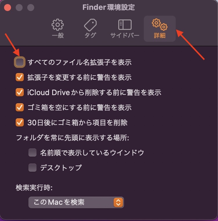 「詳細」の中から「すべてのファイル名拡張子を表示」にチェックマークを入れる。