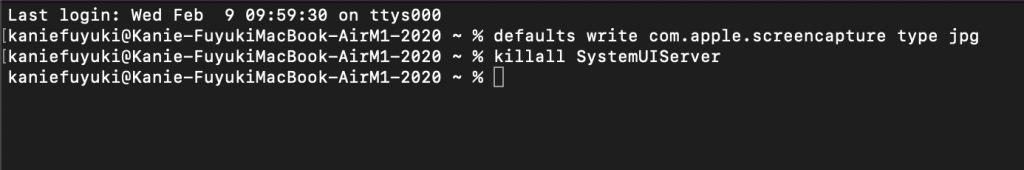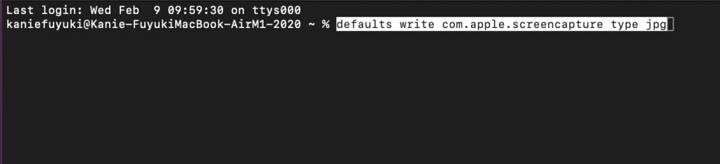 defaults write com.apple.screencapture type jpg を入力してReturnキーを押す