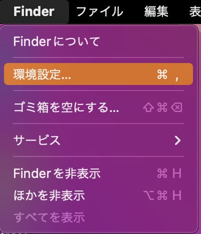 デスクトップ画面の「Finder」から「環境設定」を選択。